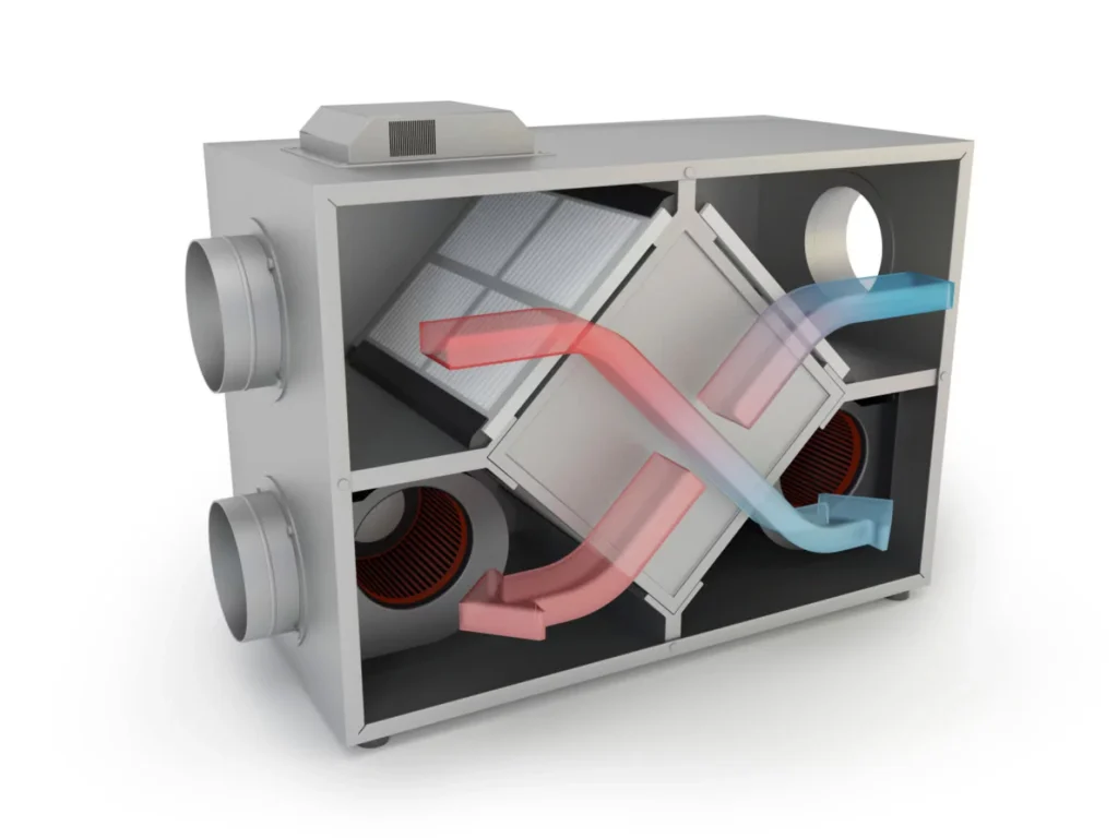 Wymiennik przeciwprądowy – powietrze wywiewane i nawiewane przepływa równolegle w przeciwnych kierunkach, co poprawia odzysk ciepła (nawet do 90%).