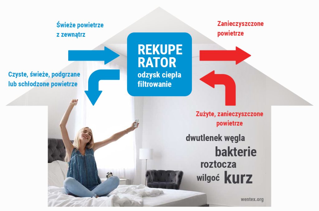 Rekuperator jednocześnie zasysa świeże powietrze z zewnątrz oraz pobiera zanieczyszczone z wnętrza budynku. Oba strumienie przechodzą przez filtr, który usuwa z nich m.in. dwutlenek węgla, bakterie, insekty, roztocza, kurz oraz nadmiar wilgoci. W wymienniku ciepła rekuperatora zużyte powietrze oddaje swoje ciepło, ogrzewając powietrze napływające z zewnątrz – bez ich mieszania. Tak przefiltrowany i ogrzany strumień trafia następnie do kanałów wentylacyjnych, dzięki którym jest równomiernie rozprowadzany po całym budynku, a powietrze zużyte zostaje wyprowadzone na zewnątrz.
